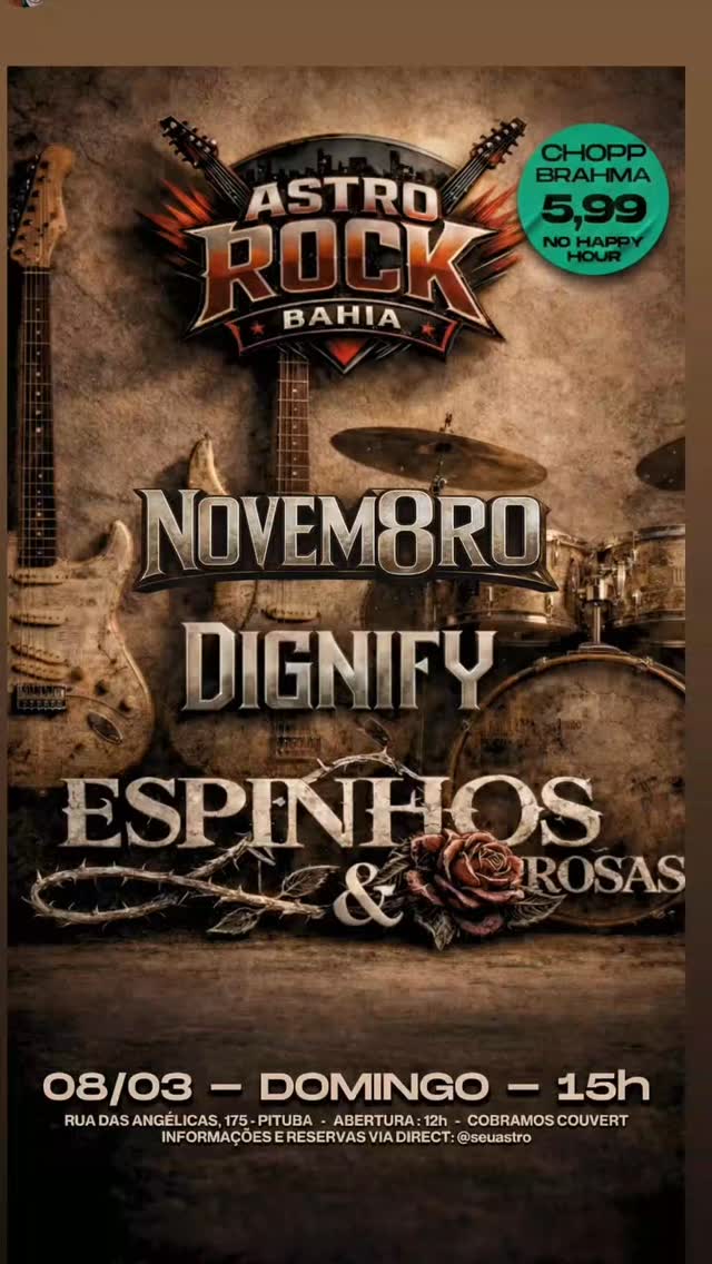 No dia da Mulher (Domingo, 8 de março), o Astro Bar, na Pituba, abre o palco para as bandas Dignify e Novembro e uma grande homenagem às mulheres feita pela banda Espinhos e Rosas. Os shows começam as 16h.