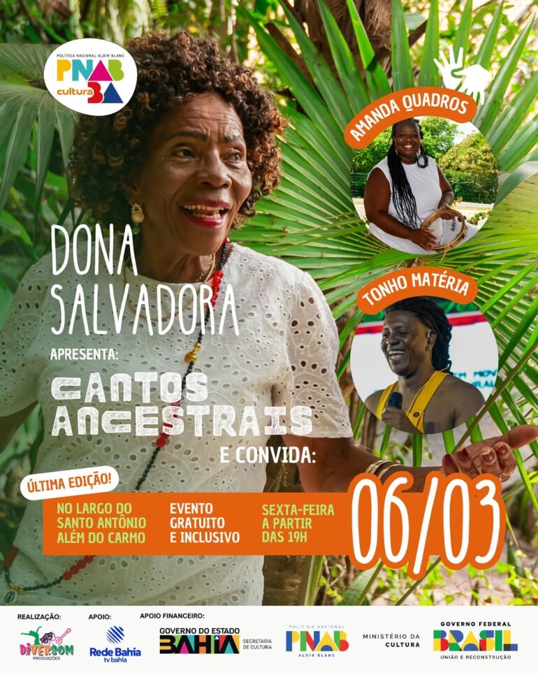 No dia 06/03 (sexta-feira), às 19h, o Largo do Santo Antônio Além do Carmo recebe mais uma vez a força e a presença marcante da nossa mestra Dona Salvadora, Dodora. É a última edição desse ciclo, e a energia promete ser daquelas que atravessam o tempo.  A noite será marcada por encontros potentes da cultura popular baiana, com participação de Tonho Matéria e Amanda Quadros.