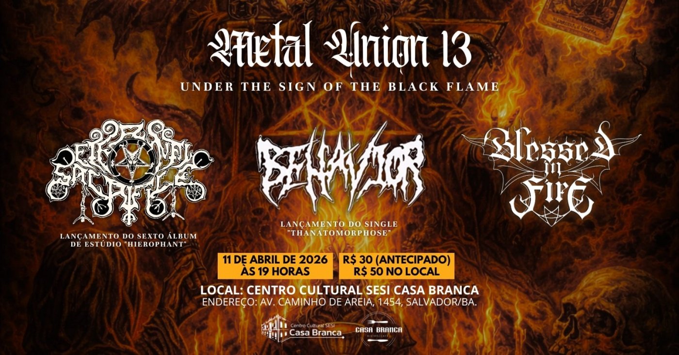 No dia 11 de abril, a partir das 19 horas, no Centro Cultural SESI Casa Branca, acontece mais uma edição do projeto Metal Union, com as bandas Eternal Sacrifice, Behavior e Blessed In Fire