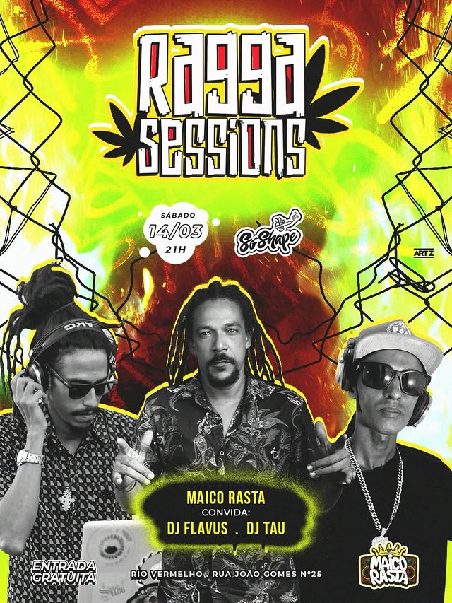 Sábado, 14 de março, acontece mais uma edição do Ragga Sessions na Só Shape, no Rio Vermelho, com Maico Rasta convidando Dj Flavus e Dj Tau para mais uma noite de Reggae, Rub a Dub, Raggamurphy, Ragga e Dancehall