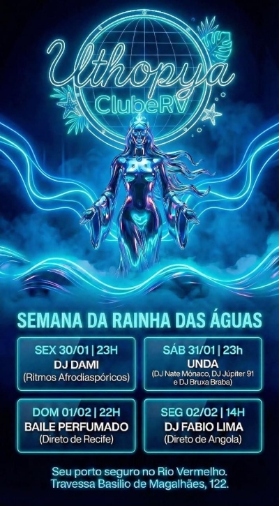 Como é característico na Bahia, em paralelo às atividades sagradas e religiosas, com seus rituais, oferendas e homenagens, temos na Festa de Yemanjá toda uma programação festiva. Uma vasta programação de shows, festas e atividades ocupa o bairro do Rio Vermelho, e cada vez mais em outros lugares da cidade. Este ano, como a festa cai numa segunda, desde a sexta-feira tem programação, na véspera, no dia 1º de fevereiro, acontece também uma infinidade de eventos, mas é especialmente no dia 2, que casas de shows, restaurantes, bares, espaços diversos e as próprias ruas do bairro recebem uma programação gigantesca com apresentações de artistas, bandas e DJs de estilos e gêneros variados. Para todos os gostos. Boa parte deles são eventos fechados e pagos dentro dos espaços, mas outros tantos colocam palcos na rua, de graça para o público. Este ano, talvez por cair num fim de semana, a quantidade de festas cresceu ainda mais. O melhor é que são iniciativas espontâneas, quase sem apoio público. Confira abaixo a programação dos festejos em homenagem à Rainha das Águas, Yemanjá, e escolha para onde ir. Há ainda festas em outros pontos da cidade e outras realizadas apenas na véspera, dia 1º, que podem ser acessadas em nossa agenda (clique aqui).