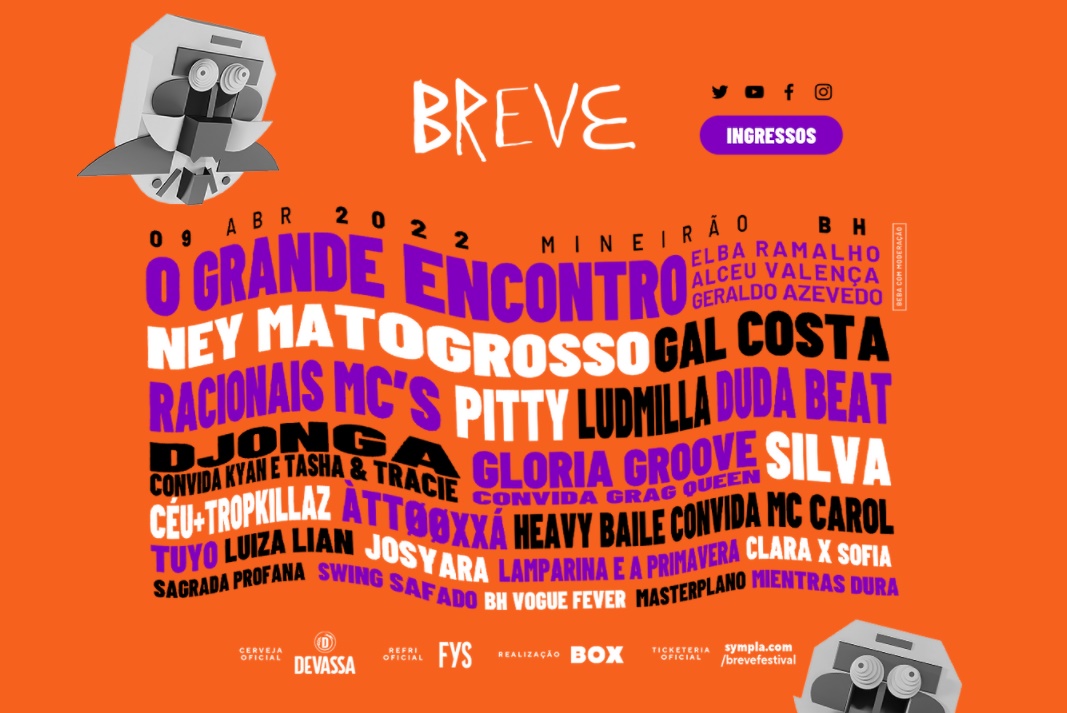 Todos os outros festivais acontecem a partir de 2022. O primeiro é o Breve, que acontece no dia 9 de abril de 2022, em Belo Horizonte. O line up alterna veteranos da MPB, nome de peso da produção nacional dos últimos 20 anos e destaques recentes. Entre eles, estão O Grande Encontro (Elba Ramalho, Alceu Valença e Geraldo Azevedo), Racionais MC’s, Pitty, Ney Matogrosso, Gal Costa, Duda Beat, Ludmilla, ÀTTOOXXÁ, Djonga, Céu, Josyara e Luiza Lian.